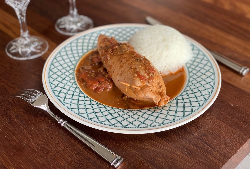 2/ Faites revenir dans une cocotte avec des oignons autour. Puis ajouter des tomates pelées et 1/2L de vin blanc sec. Saler légèrement.